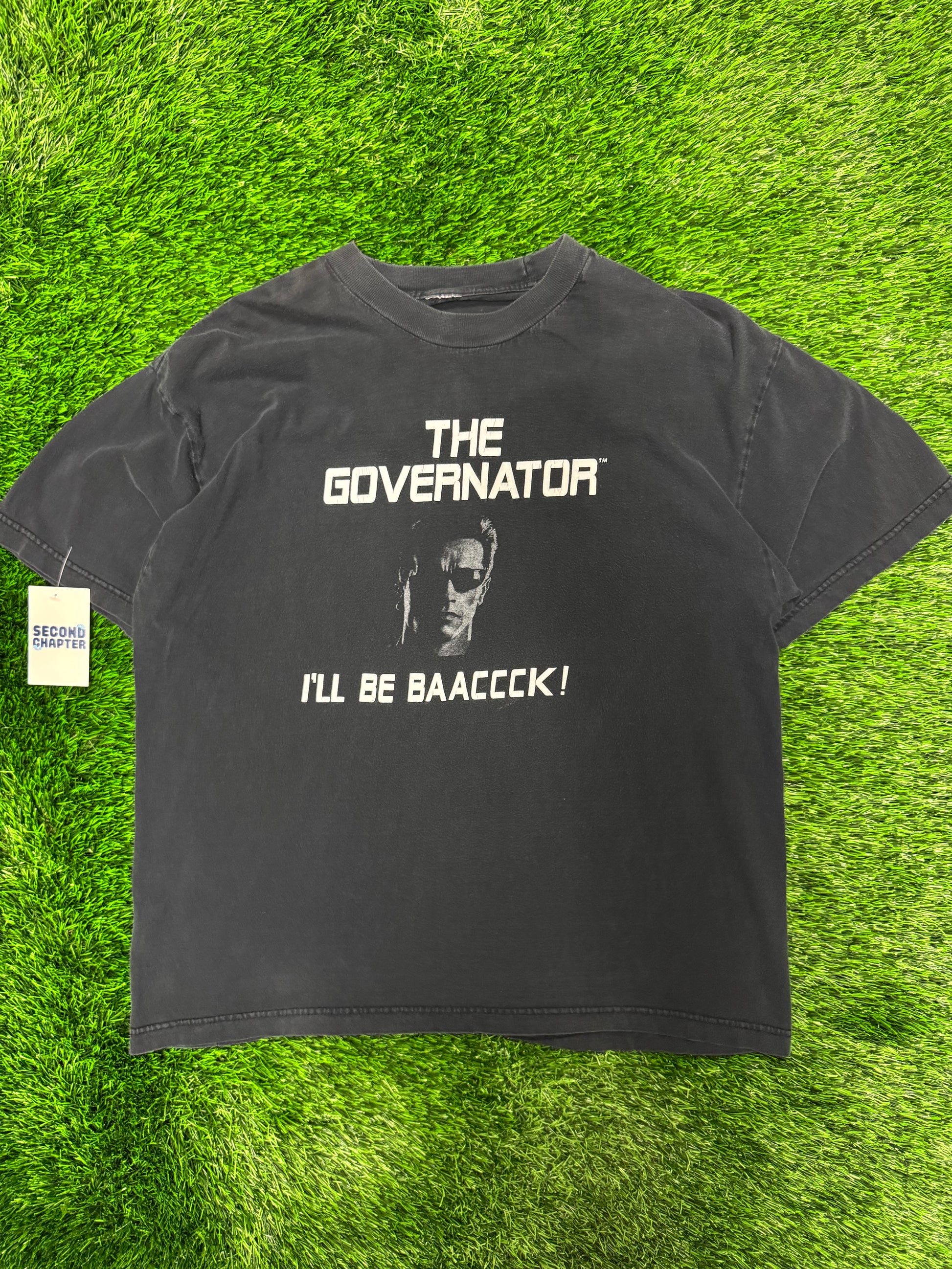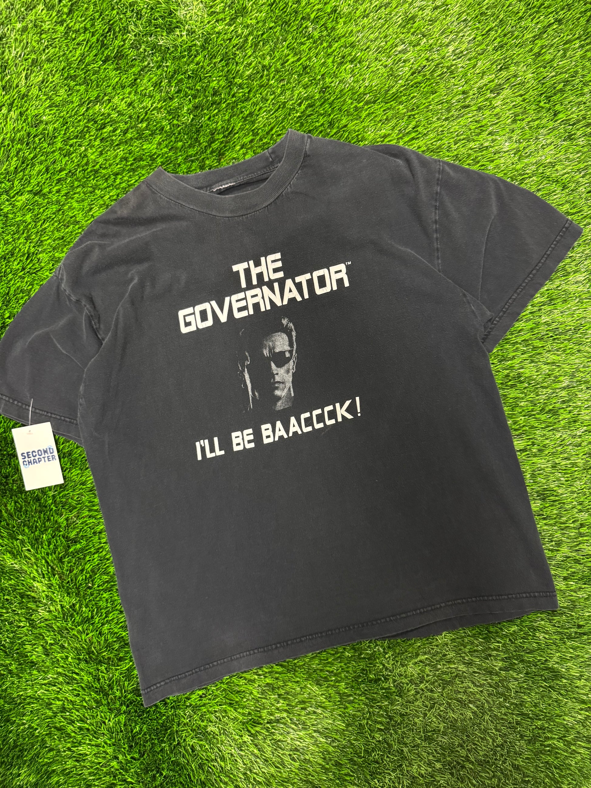 00s Arnold Schwarzenegger The Governator "I'll Be Baaccck!" Vintage Terminator Parody Tee (XL)